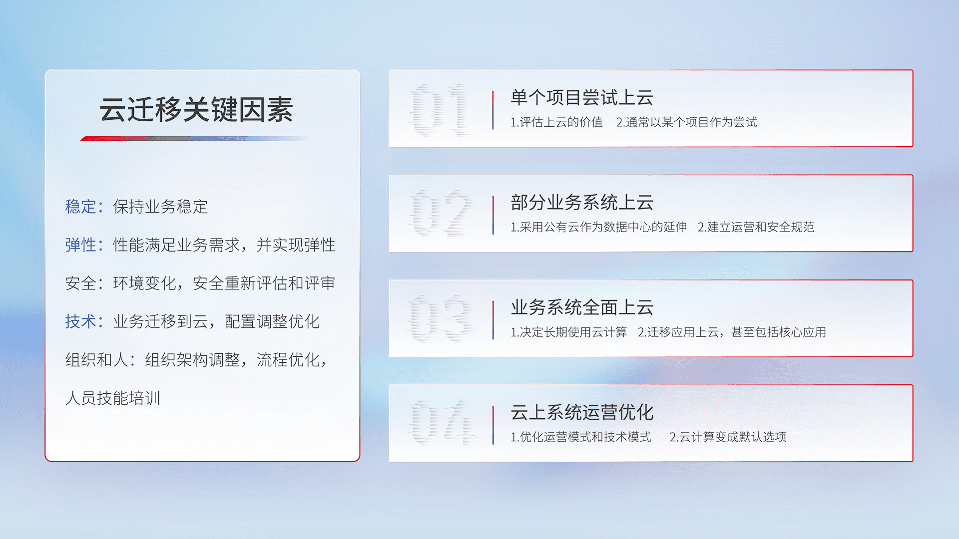 结合实际业务,,从规划设计、、、云平台选型、、、云原生改造、、数据迁移、、集成交付,,,,迁移全过程为客户识别最佳上云路径,,,,做好风险识别管理,,设计网络架构、、、、身份权限、、、安全审计合规、、、、操作审计、、日志审计、、监控告警策略、、多站点容灾设计等,,,,对云上基础设施进行整体规划,,提升IT治理水平,,以满足弹性、、高可用、、、、高性能的需求。。。